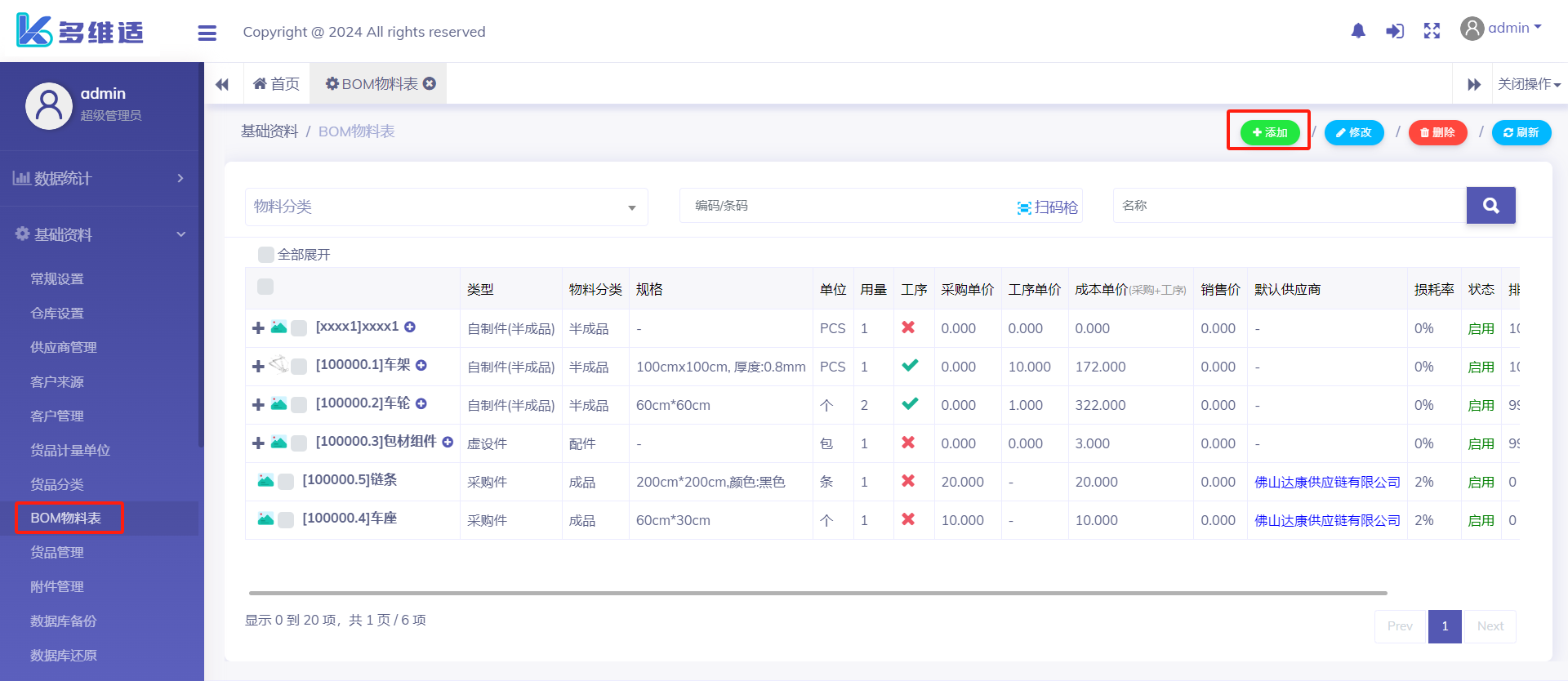 添加一级物料表:在BOM列表页点右上角的“添加”按钮如下图所示: