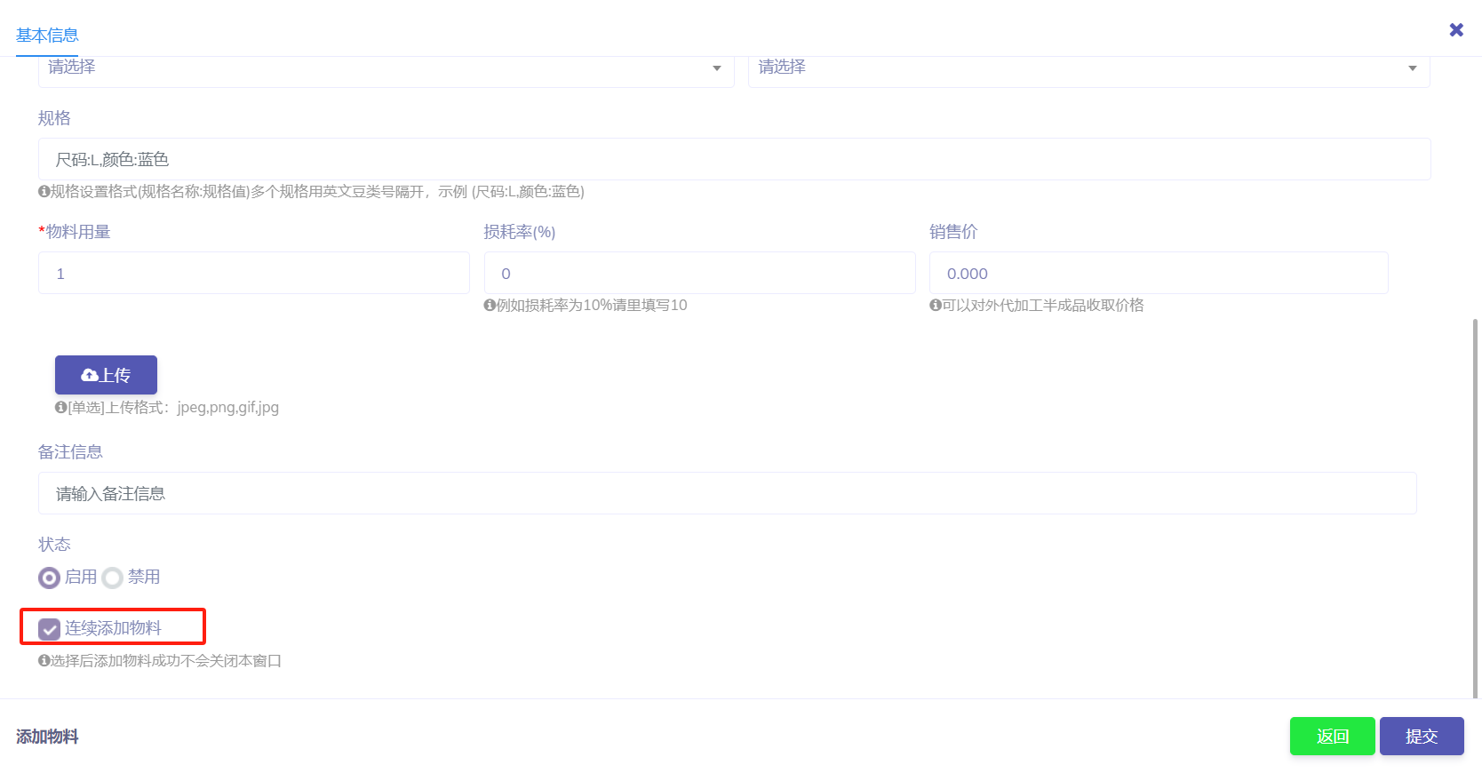 在弹出层中按指示进行编辑,在下方的“连续添加物料”选项中被选中的情况下提交后不会关闭当前界面你可以继续添加一级物料如下图所示(默认是选中):