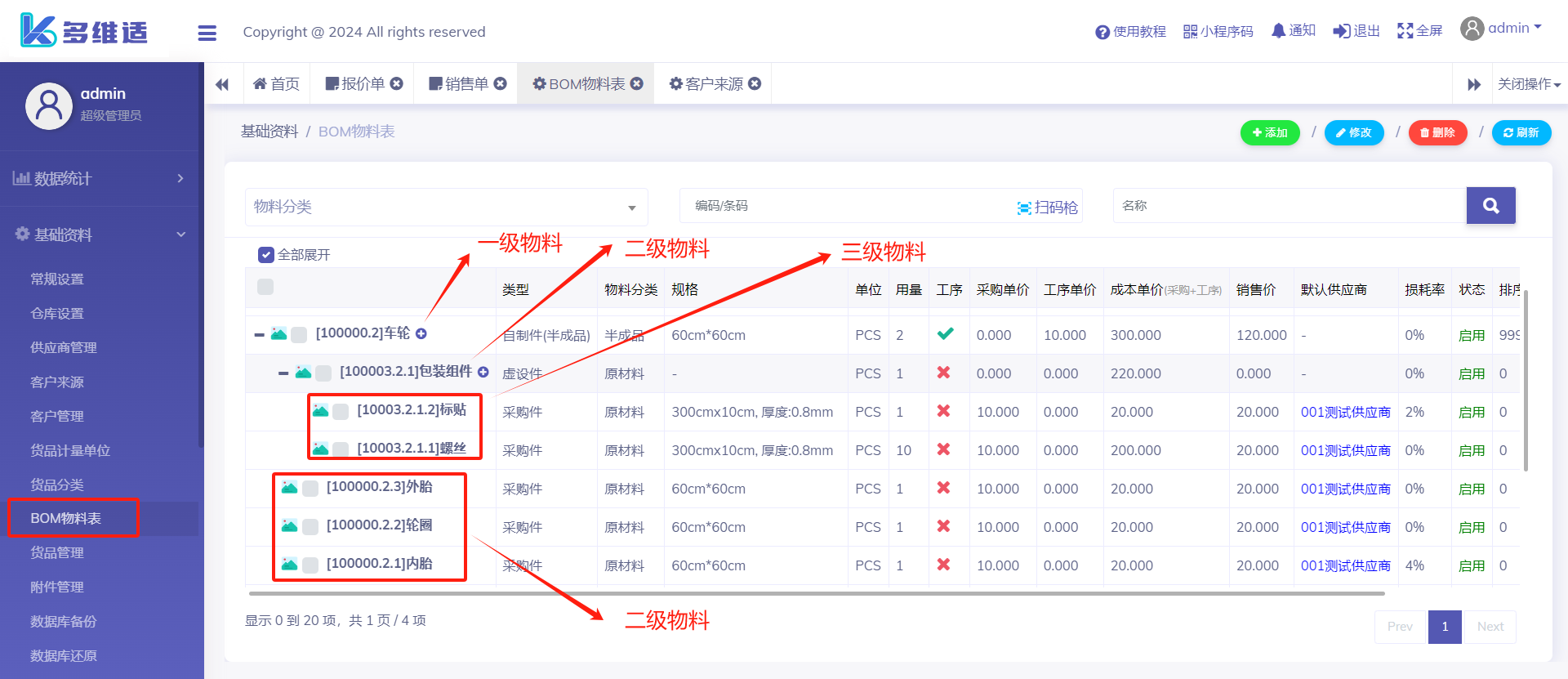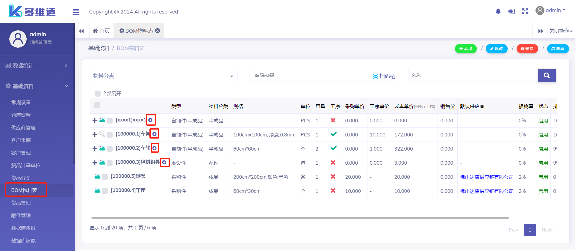 注意:BOM物料表的修改会影响已经使用本物料表的成品。