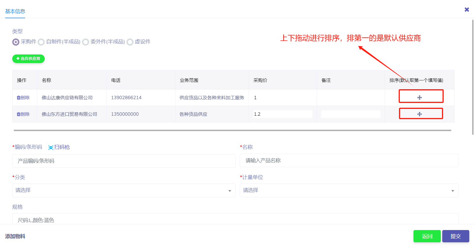 在添加物料“采购件”类型时你需要配置该采购件的供应商,每个供应商的品质和价格有区别,当你全部关联好后在列表页可随时更换默认供应商;或者你在编辑物料界面选择供应商后可用拖曳的方式来排序,排第一的就是默认供应商。