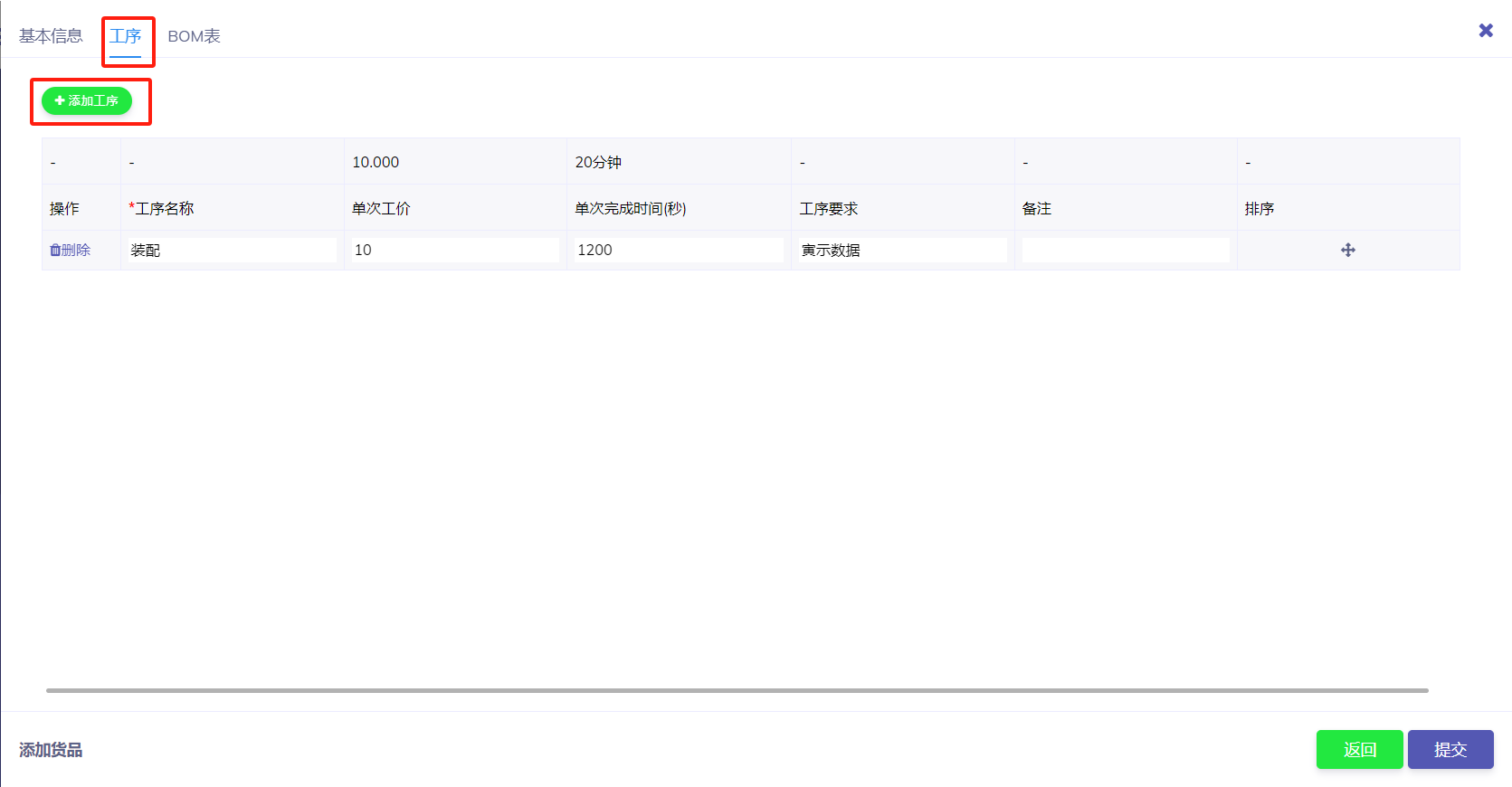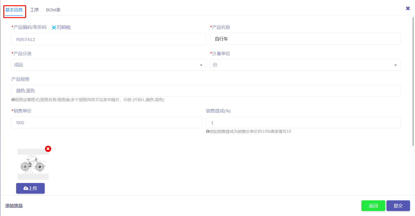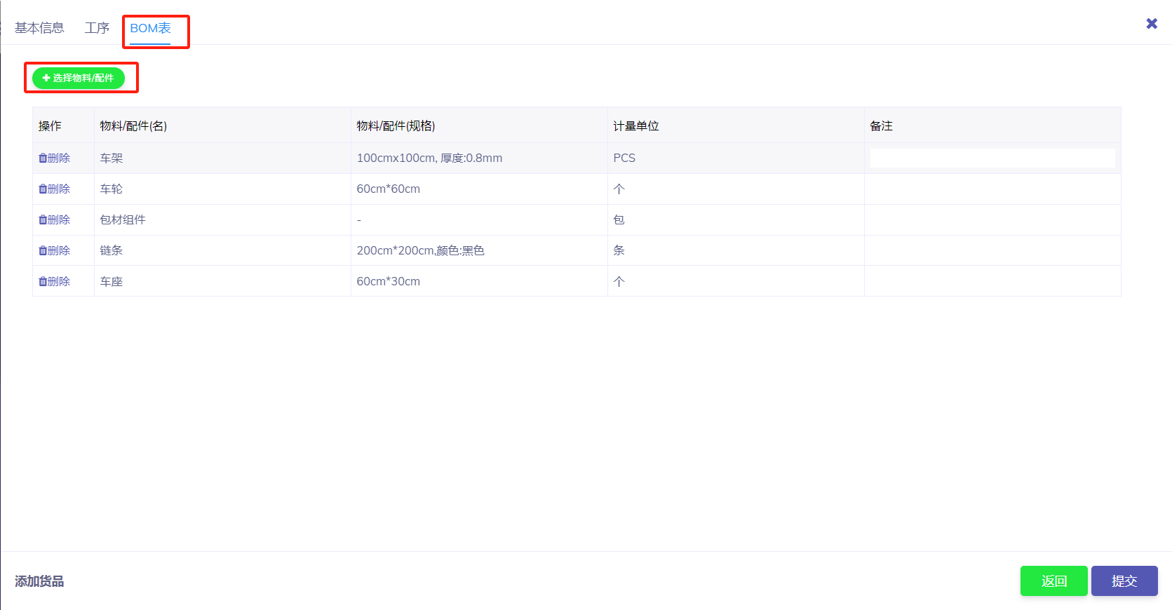 现在我们来创建一个生产成品把它的所需BOM物料表串联起来,货品管理页点右上角的“添加”按钮弹出编辑界面,其中“工序”和“BOM表”是必选的,这个自行车产品是由BOM物料表组成如下图: