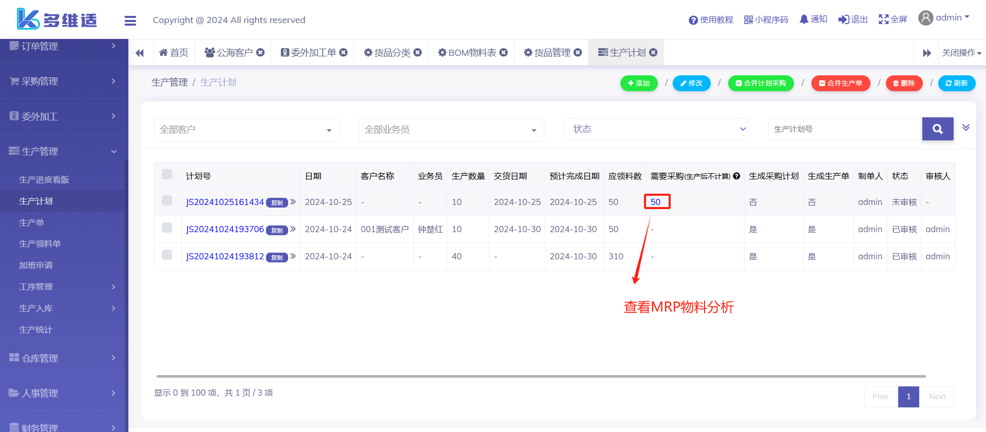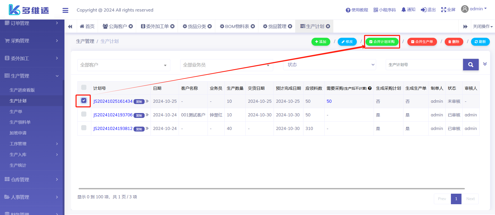 当MRP计算需要采购物料时,我们可以选择对应的生产计划单合并采购计划
