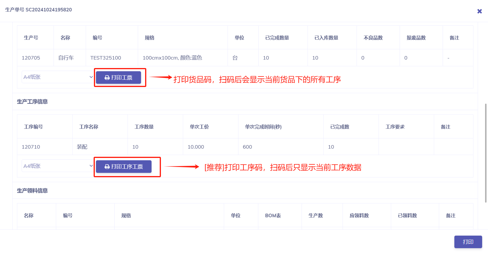 审核生产单后,我们需要对生产单货品进行打印工票二维码,因为生产工人会通过工序完成时扫码登记,然后由质检员审核工序。打印工票如下图所示: