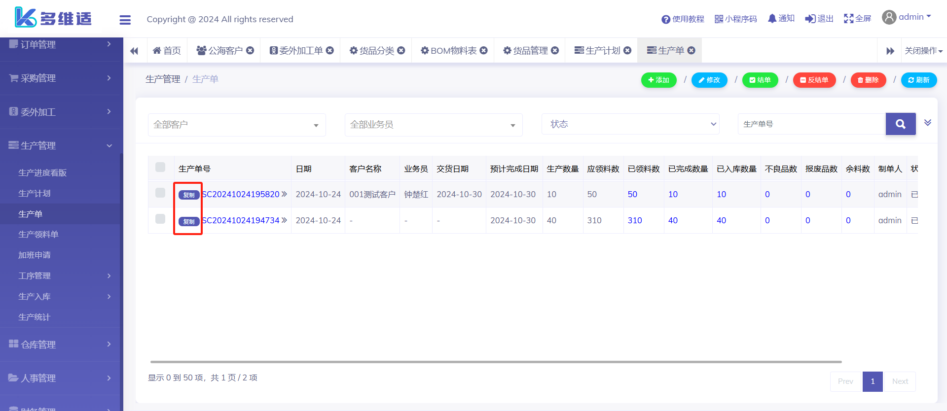 我们复制生产单页面需要领料的生产单号,如下图所示: