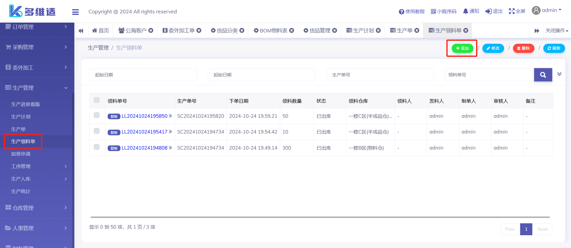 打开生产领料单页面点右上角的“添加”按钮