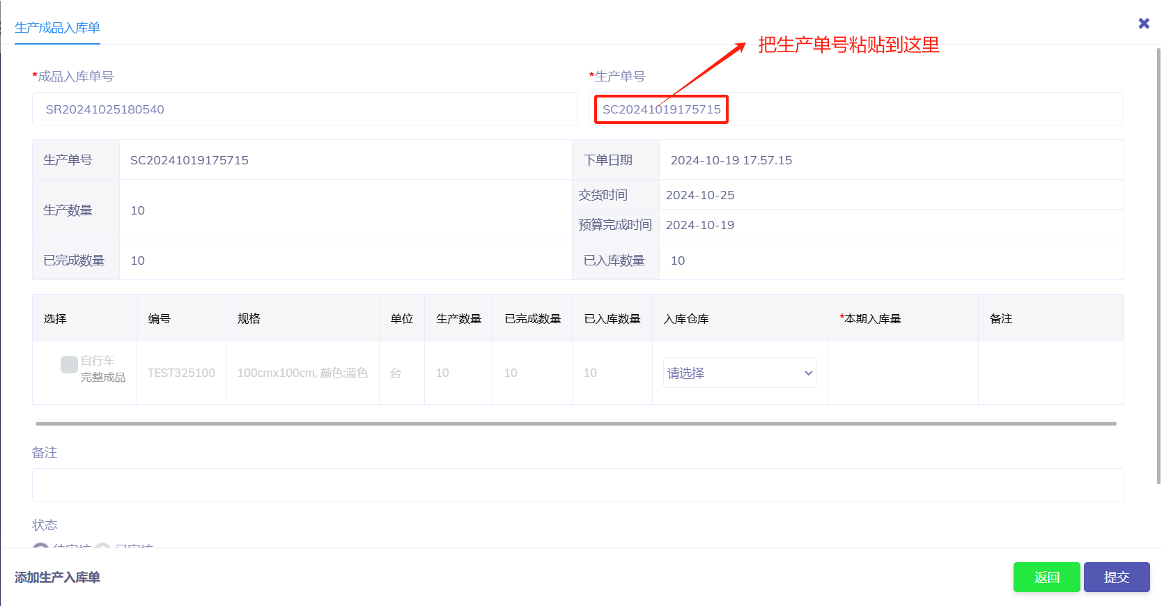 成品/半成品入库,不良品入库, 报废品入库以及余料入库方法是一样的,都是可以分批多次入库。在生产单页面复制需要入库的生产单号,找到对应需要入库的页面点右上角的“添加”按钮弹出编辑框把生产单号复制到指定的输入框如下图所示: