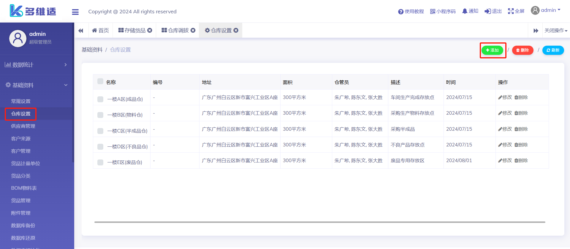 上图的例子说明,仓库使用是可以灵活变通的,我们可以把它当一个仓库使用然后设置各种仓位,也可以每一条数据就是一个完整仓库。为什么仓库要放在“基础资料”而不放到“仓库管理”模块,因为仓库设置是一个严谨功能,在使用ERP系统前应第一时间设置所有仓库,如不够用可以后期增加。