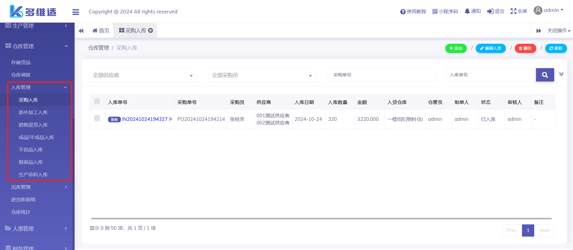 入库管理-通常情况不需要在这里开单处理,这里的入库单是其它业务申请入库时,这里才有信息。如采购入库先由采购员开入库单就会同步到这里,入库状态只能在这里操作。当然这里也能直接开入库单,根据企业管理习惯灵活应用。