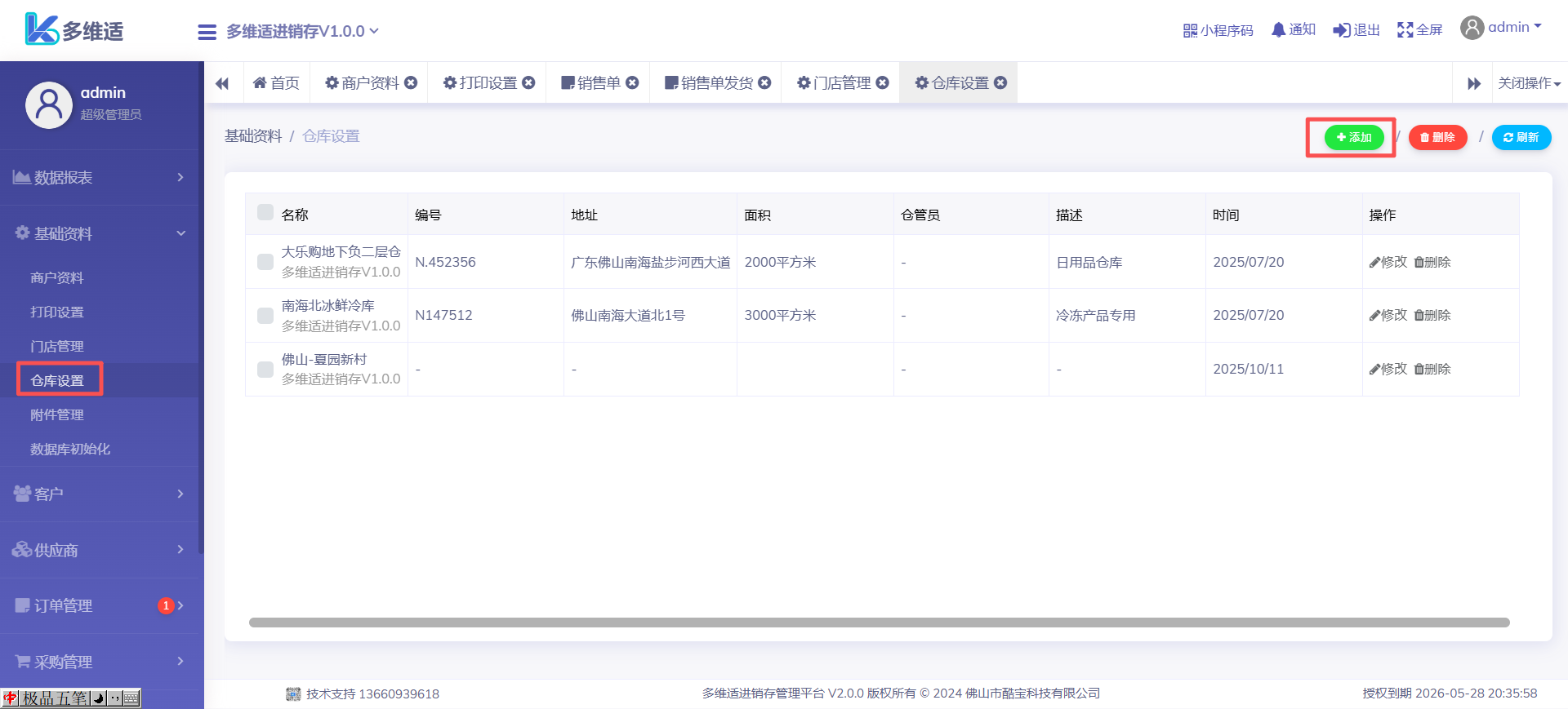 如需要使用多仓库功能,可在此添加你的仓库名称、位置、面积等仓库信息。你还可以把仓库设置当成库位处理,例如我们只有一个仓库,然后把这个仓库分成多个库位存放不同的商品如:五金仓位、劳保仓位、工具仓位等等或者你还可以把仓位当货架也是可以的。