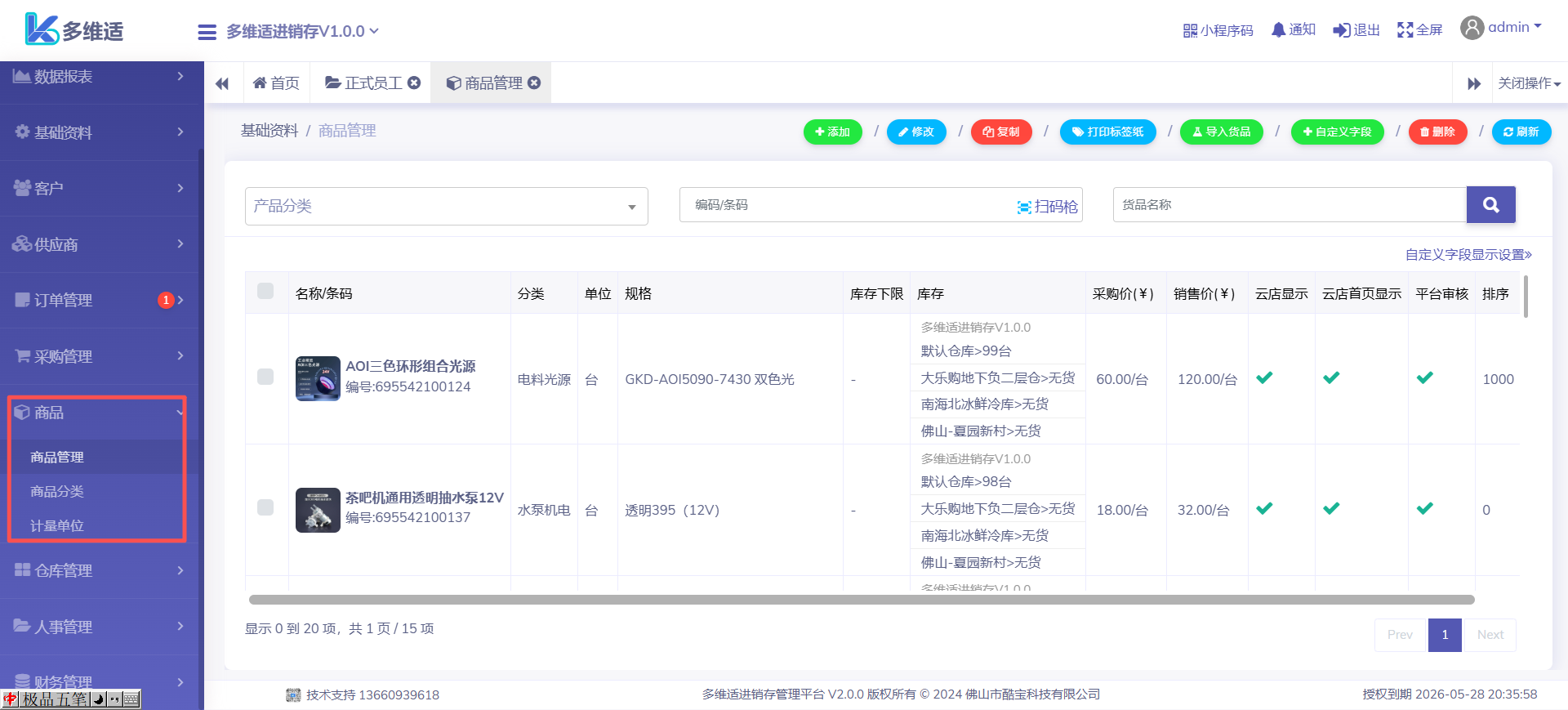注意:如果某个商品已有出入库记录后,将不能修改计量单位。