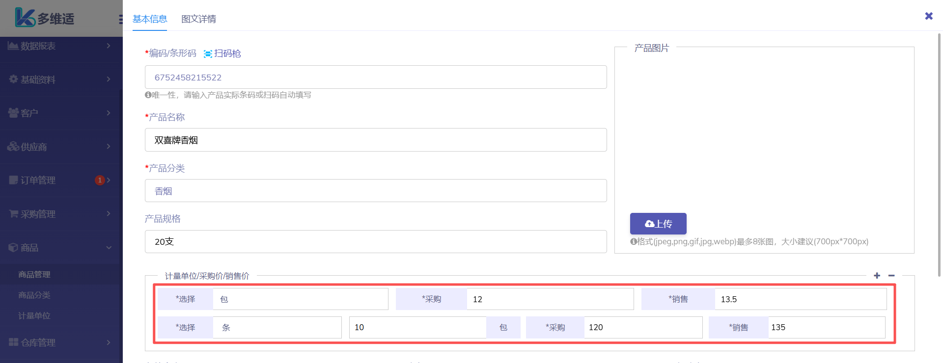 上图可以看出以香烟为例:第一个单位是“包”,第二个单位是“条”,那就是一包香烟采购价12元,销售价13.5元;第二个单位一条香烟等于10包,采购价120元,销售价是135元;你还可以继续再推出一个枞向单位“箱”,一箱等于100包,采购1200元,销售价1350元;以此类推枞向多单位最多可设置5层。