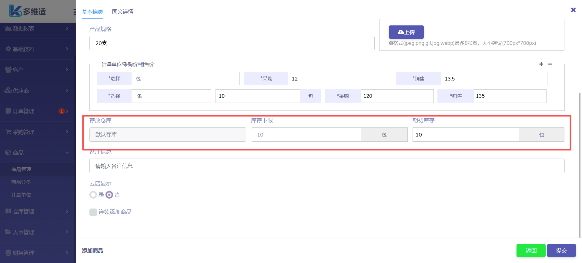 注意:“库存下限”和“期初库存”单位必须要与上面设置的计量单位相匹配,不能上面是“包”或“条”这里是“盒”这样就不匹配了。