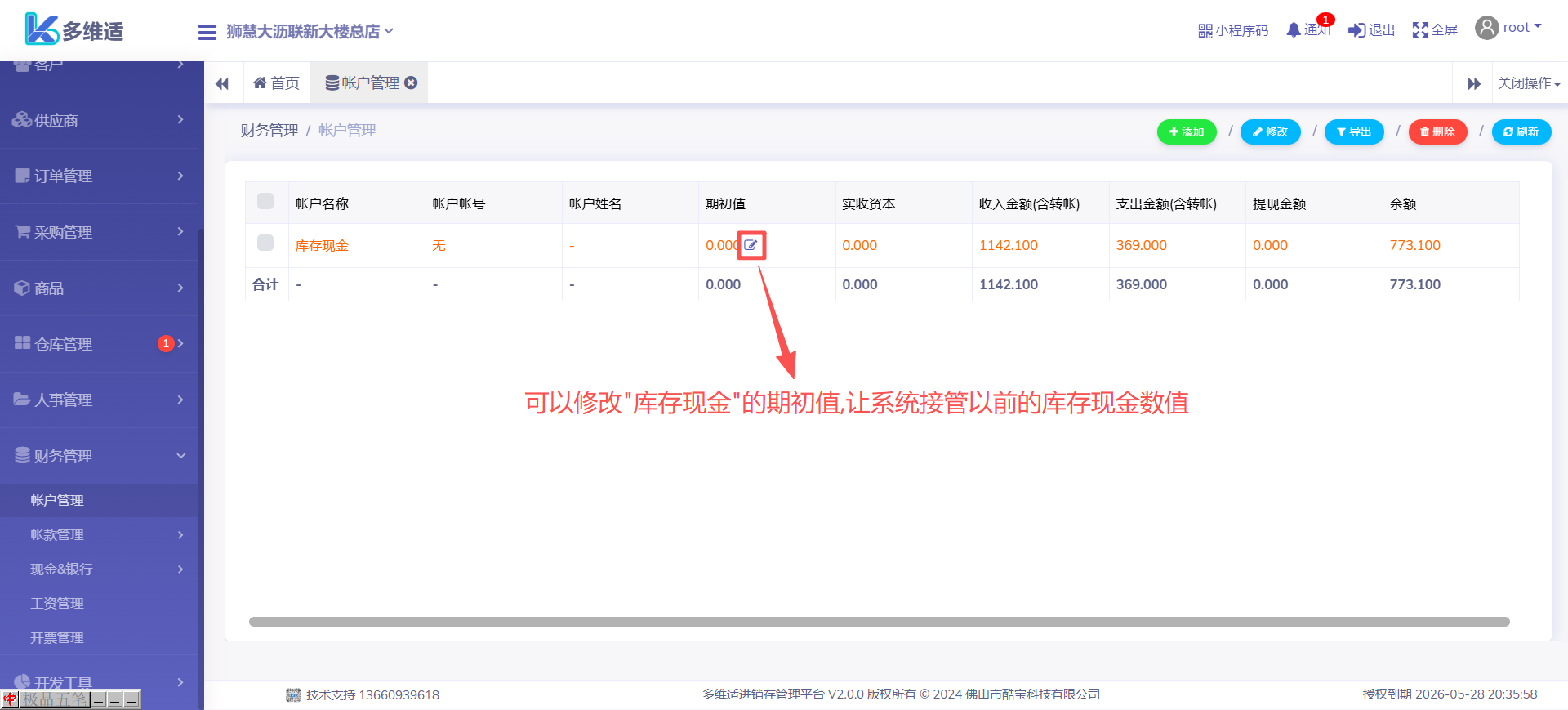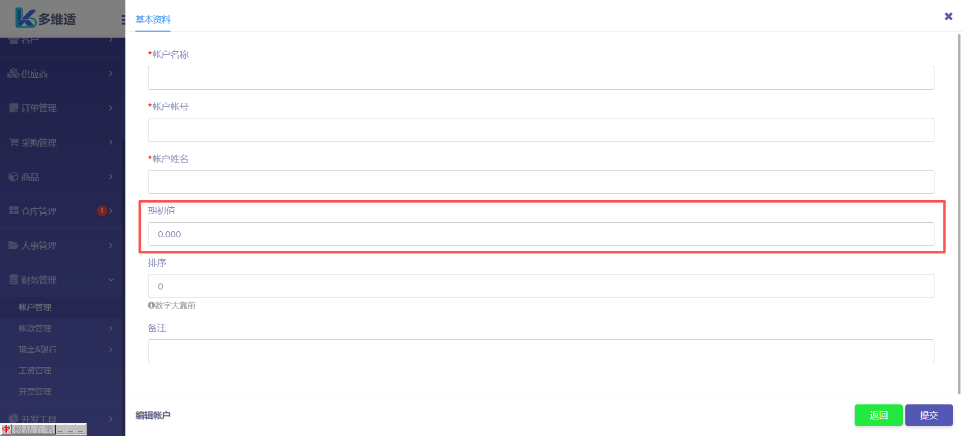 你还可以添加其它的营运银行帐号或微信收款帐号以及支付宝收款帐号等,满足你的现金流管理;点右上角的“添加”即可编辑其它收付款帐户,同样可以设置期初数值如下图: